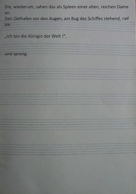 Die, wiederum, sahen das als Spleen einer alten, reichen Dame an. Den Zielhafen vor den Augen, am Bug des Schiffes stehend, rief sie: „Ich bin die Königin der Welt !“, und sprang.