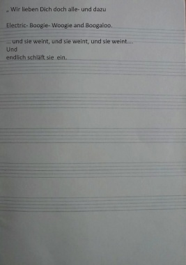 „ Wir lieben Dich doch alle- und dazu Electric- Boogie- Woogie and Boogaloo. … und sie weint, und sie weint, und sie weint…. Und endlich schläft sie ein.