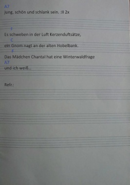 A7 jung, schön und schlank sein. :II 2x F Es schweben in der Luft Kerzenduftsätze, C ein Gnom nagt an der alten Hobelbank. F Das Mädchen Chantal hat eine Winterwaldfrage A7 und ich weiß… Refr.: